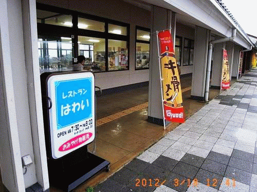 鳥取に行きました。羽合の道の駅では「牛骨ラーメン」「もさ海老」「かれい」「はたはた」がありました。白兎海岸の道の駅では ちくわです。《ますだ・豊中》【2012/03/18 撮影】